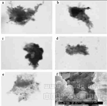 a —絮凝時間10 s (快攪結束時拍攝) ; b —絮凝時間50 s (慢攪過程拍攝) ; c —絮凝時間180 s (慢攪過程拍攝) ; d —絮凝時間600 s (慢攪結束時拍攝) ; e —攪拌停止15 s 后拍攝; f —a 圖的局部掃描照片(放大倍數為5 000 倍) a~e 為絮凝體顯微攝像照片(放大倍數為180 倍)