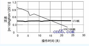 LF10膜除具有低壓膜的優點外,其耐污垢特性好,與常規RO膜相比,LF10膜處理含表面活性物質的廢水時,其水通量不會明顯降低。見圖7。