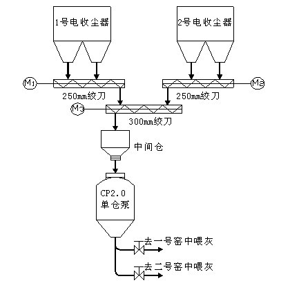 該廠有三條Ф3.5m×135m濕法回轉窯,其中3#窯系統設計較合理,其窯尾收塵器采用的是75m2的臥式電收塵,收集的灰塵由Φ300mm的螺旋絞刀、Φ135mm螺旋泵輸送,經喂灰裝置喂入窯內,滿足了生產要求。而1#和2#窯系統存在明顯的設計缺陷,其窯尾收塵器均采用的是60m2的立式電收塵,兩窯尾共用同一輸送系統,由兩條Φ250mm的螺旋絞刀、一條Φ300mm的螺旋絞刀、一臺CP2.0的單倉泵組成(如圖1所示)。使得后兩臺設備幾乎沒有正常維修的機會;當兩個系統同時灰多時,Φ300mm絞刀輸送能力偏小;兩臺窯系統的窯尾灰合到一起之后,很難合理地重新分配到兩個窯中喂灰系統,常因分配不合理而影響大窯鍛燒;電收塵與螺旋絞刀之間沒有鎖風閥,從絞刀進入的冷風進入電收塵器中,一方面加快了收塵器極板、極線等的腐蝕,另一方面上升的氣流使電收塵內已沉降的粉塵再次揚起(二次揚塵),影響收塵效率。