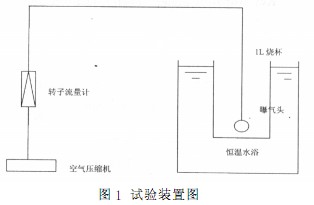 試驗裝置見圖1。該裝置采用空氣為氣源,用空氣壓縮機加壓后,通過轉子流量計控制氣體流量,曝氣頭采用砂芯曝氣頭,向1L燒杯中水樣充氧,形成氣液接觸,對水樣中S2-進行催化氧化,同時用恒溫水浴控制反應溫度,用秒表計時。
