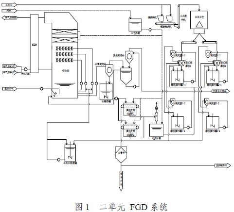 熱電分公司FGD系統如圖1所示。工藝系統主要包括:煙氣系統、SO2吸收系統、吸收劑制備系統、石膏脫水系統、工藝水系統、廢水處理系統、電氣及自動控制系統。主要設備包括:增壓風機、煙氣擋板門、回轉式換熱器(GGH)、吸收塔、除霧器、噴淋管、氧化風機、吸收塔循環泵、石灰石破碎機、濕式球磨機、石灰石漿液旋流器、石膏漿液旋流器、真空皮帶脫水機、石膏炒制及制板設備等。