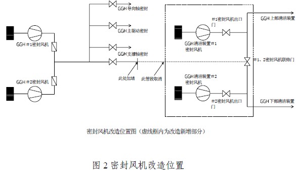一單元脫硫GGH兩臺密封風機為GGH支撐軸、導向軸、GGH主驅動和兩臺GGH清洗裝置提供密封風,但投產后兩臺密封風機不能滿足設備要求,致使清洗裝置漏風嚴重,對設備產生腐蝕,經增容仍不能達到要求,后與廠家協商,為保證清洗裝置有良好的密封效果,將原通向清洗裝置的密封風管加死堵,為兩臺GGH清洗裝置各安裝一臺密封風機,提供密封風,風機型號為SE0300C、額定功率2.2kW、最大靜壓190mbar、最大風量320立方米每小時。加裝位置見圖2: