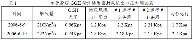 按廠家原設計,每臺密封風機只為一部GGH清洗裝置提供密封風,但通過對以往增壓風機運行數據分析,得出一臺風機就可滿足兩部GGH清洗裝置的需要,所以我們提出在兩臺密封風機出口管之間加裝聯絡門,采取一運一備的運行方式,這樣既可以保證設備安全運行又方便檢修。這一建議在機組投運后所作測試(見表1)中得到論證。通過對三個月來的運行情況檢測,效果非常理想。