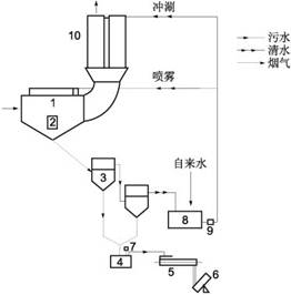 圖2 濕法高壓靜電組合式除塵工藝流程 1.噴霧箱;2.檢查門;3.過濾器;4.污水箱;5.雙軸攪拌機;6.成球盤;7.污水泵;8.清水箱;9.清水泵;1O.電場 |