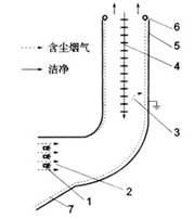 圖1 濕法高壓靜電除塵原理 1.噴嘴;2.噴霧箱;3.荷電粉塵;4.電暈線;5.煙囪(集塵極);6.沖刷管;7.污水 |