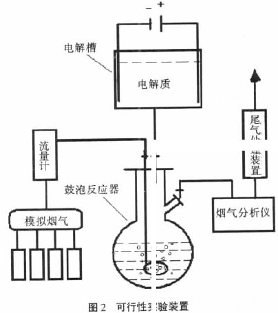 ( 2) 實驗器材:自制電解槽;鈦基涂二氧化鈦/二氧化釕陽極( Ti/TiO2-RuO2) ;石墨陰極( 陰陽極均采用平板式) ;鼓泡反應器;模擬煙氣裝置;煙氣分析儀;尾氣處理裝置。