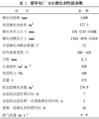 望亭電廠SCR裝置采用日本三菱株式會社生產的蜂窩式催化劑,催化劑為2層正常層和1層附加層。正常層總體積和附加層體積均為254. 6m3。其性能參數見表1。
