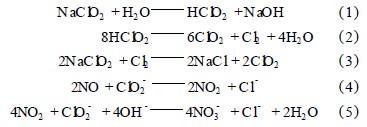 NaClO2 溶液濕法脫除NOx 的反應比較復雜,許多學者認為這個反應是氣膜控制的吸收氧化反應, NOx 要通過N2O3 和N2O4 的水解而被吸收。NO可以在水溶液中被NaClO2 氧化。在該反應過程中, NO被氧化成NO- 3 ,而ClO- 2 轉化為Cl- 、ClO- 。推測堿性溶液中的反應式如下[ 4 ] :