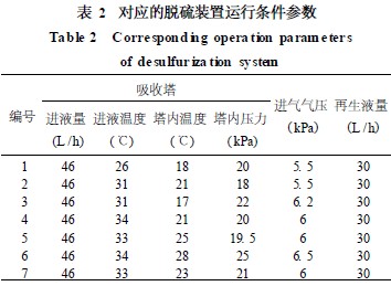 表2為表1各數據測量時同步測定記錄的脫硫裝置運行條件參數。由表2可知,絡合鐵脫硫裝置運行穩定。吸收塔進液量保持46 L /h不變;進液溫度從26 ℃開始上升至31 ℃,并穩定在33~34 ℃左右;塔內溫度隨進液溫度變化波動;進氣氣壓控制在 515~615 kPa之間以保證進氣量的穩定;再生塔的再生液量維持在30 L /h,確保脫硫裝置再生循環部分的正常運行。