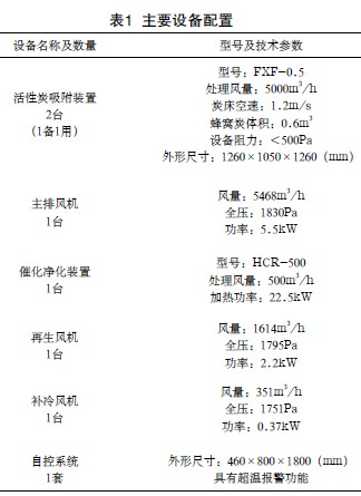 活性炭吸附裝置一備一用,當一臺設備處在運行狀態下,另一臺設備處于再生或備用狀態。主要設備配置見表1。