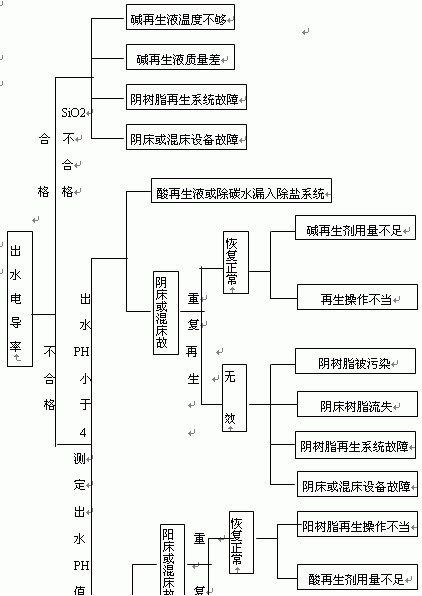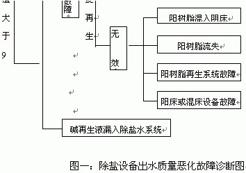 除鹽系統設備故障診斷應用較多的是排除法,圖一是除鹽設備出水水質惡化故障診斷圖,在故障診斷過程中,我們可以先檢查系統出水的電導率是否合格,然后再根據系統出水二氧化硅和pH值的合格情況進行進一步的排查分析,看看設備是否需要作重復性再生試驗。用排除法進行故障診斷可以縮短離子交換器設備故障的排除時間,縮小故障排除的工作范圍,在診斷過程中一般先檢查陰離子交換器出水的水質,在確定陽陰離子交換器無故障后再檢查混合離子交換器有無異常。