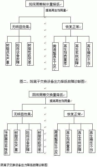 發現陽陰床等離子交換設備出力明顯降低時,可按圖二、圖三分別判定設備的故障原因。混合離子交換設備出力降低可以參照圖二或圖三故障診斷方法和順序進行問題的排查。