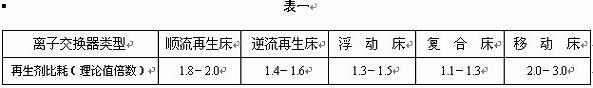 當離子交換器偶爾發生出水水質劣化或者出力降低時,采用重復再生或增加再生劑的用量等方法進行設備性能恢復是正常的。筆者所說的運行經濟指標降低故障系指設備再生劑的比耗明顯大于或超過表一所示對應數值。
