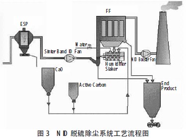 NID脫硫除塵一體化技術是Alstom公司在20世紀90年代初從噴霧干燥法開發而成。該系統是利用含有CaO或消石灰的吸收劑與二氧化硫反應生成CaSO3和CaSO4,除塵器收集下來有一定堿性的粉塵與CaO混合增濕后再進入除塵器入口煙道和煙箱,反復循環。NID脫硫除塵系統包括反應器、高濃度除塵器(ESP或FF)、混合器、循環灰輸送系統四個核心系統。中國武漢鋼鐵公司正在進行NID脫硫除塵工藝的設計建設。NID脫硫除塵系統工藝流程見圖3。