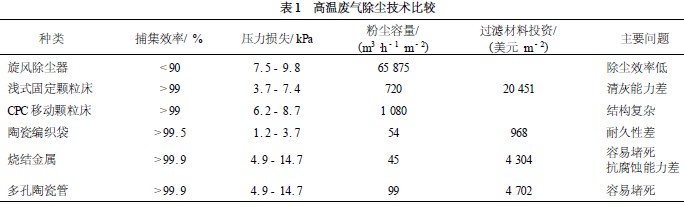 EPRI 曾綜合除塵效率、經濟性等因素,對各種高溫氣體除塵技術作過總結,結果如表1 所示[5 ] 。