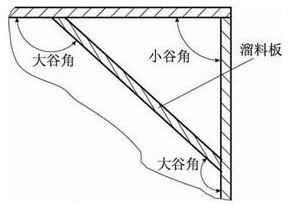 由表1可以看出,有導電纖維較無導電纖維針刺氈表面電阻、體電阻和摩擦電位都低得多。為防止煤粉自燃,結構設計不能有積灰面。設備設計要符合防爆要求,本體上還必須裝有卸壓閥。煤磨袋除塵器的灰斗是很容易積灰的,煤粉塵細度細,粒度小于40μm的占95%以上,附著性強,粉塵還可能吸收空氣中的水分,在灰斗壁上冷凝。所以灰斗壁的傾角應≥70°。在灰斗兩面形成的谷角處,設計一溜料板,成為兩個加大的谷角,減少粉塵的沉積,如圖1所示。