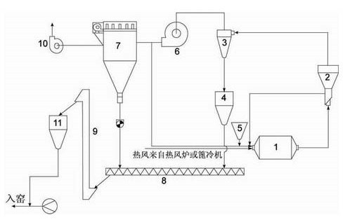 1.煤磨;2.粗粉分離器;3.細粉分離器;4.煤粉倉;5.原煤倉;6.煤磨風機;7.MDC袋除塵器;8.螺旋輸送機;9.斗式提升機;10.排風機;11.煤粉倉