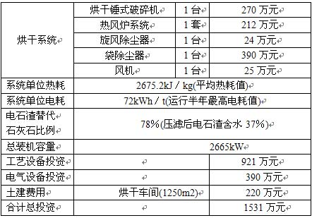 該生產線運行半年后,由烘干錘式破碎機烘干的電石渣含水量可以穩定保持在0.9%~l.5%之間。系統單位熟料熱耗平均值為2675.2kJ/kg,系統單位電耗最大值為72kWh/t,烘干錘式破碎機產量為 55t/h,完全能滿足生產需求。烘干系統工藝投資概算見表2。