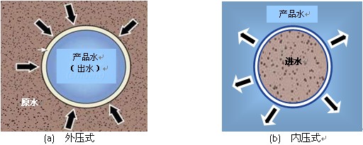 (2)內壓式:系統進水從中空纖維膜絲的內部由內而外通過膜產生產品水(進水在內,產品水在外),無死角,適于水質良好的原水。但如果來水水質較差,則較外壓式膜而言抗污染能力差,且需要更嚴格的預處理;此時一般可考慮選擇內壓式毛細管膜(膜絲內徑較中空纖維膜絲粗,通常大于1mm)錯流過濾或外壓式膜。