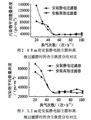 試驗通過先行已做標定的2 臺Y09 - 9 型粒子計數器, 分別在室內標高為0. 8 m 和1. 2 m 處測得不同高度下的含塵濃度,結果如圖(2) 和圖(3) 。