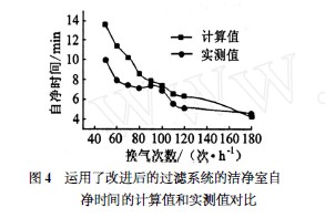 由圖4 可以看出,式(6) 的自凈時間計算方法對改進后的過濾系統來說不適合,但是圖5 的比較可知改進后的過濾系統使潔凈室自凈時間減短,這主要是由于其阻力小的原因。