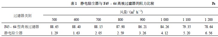 本試驗用的高效過濾器屬于無隔板過濾器,濾料為超細聚丙烯,型號為F45 - 64 ,45 代表濾袋直徑,64 代表濾袋個數。這類過濾器相對于其他高效過濾器而言,主要特點是阻力較小。而本試驗采用的靜電除塵器的面積為520 mm ×300 mm ,陽極電暈線直徑為0. 25 mm , 陰極呈蜂窩狀正六邊形, 六邊形對邊相距30 mm , 其凈流通面積比較大。表1 的試驗數據表明, 靜電除塵器的阻力比F45 - 64 高效過濾器小得多。