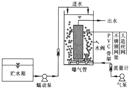與普通的自生動態膜生物反應器相比,該反應器具有如下特點:①采用管式膜,共分為3層,內部為中空的PVC支撐骨架,中部為不銹鋼絲網均勻支撐層,外部為孔徑非常均勻的人造絲網(孔徑約50 μm),混合液透過過濾面進入膜組件內的空腔,并通過收集管自流出水;②采用側向曝氣和下方曝氣,曝氣強度分別為12、36 m3/(m2·h);③活性污泥與生物膜共同作用,而且懸浮填料的翻動摩擦還可防止動態膜增長過快,從而延長了清洗周期,保證了反應器出水水質的穩定性。