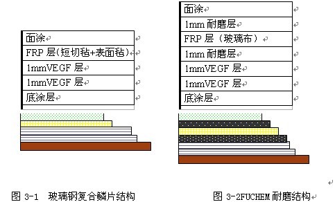 作為一個重防腐蝕性質的工程而言,材料的本身特性是一個基礎保障,但是如何運用高性能的襯里材料包括設計方案更是一個高要求的技術性工作,在玻璃鱗片襯里工程中,也發現了即使采用進口的材料,但最后工程防腐蝕失效或者是役期縮短的情況也時有發生,在排除施工因素外,工程設計方案的不足也是一個主要原因。在FGD裝置中,最容易出現技術問題的吸收塔,筆者比較了許多公司的設計方案,發現各有差異,但一些公司提供的技術方案更多地是從成本方面考慮的,差異主要集中于對于鱗片耐磨結構層的差異,國內一些公司在耐磨處理上,會采用簡單的玻璃鋼復合鱗片結構(圖3-1),就是在1-2mm的鱗片結構上再加襯1-2mm的玻璃鋼結構,相當于FUCHEM-3或者是FUCHEM-6結構(材料造價相差100元/平米左右),而我們建議是以下結構(圖3-2),而我們發現日本富士公司等技術資料也是采用后者的耐磨結構。