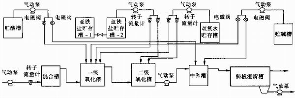 中試流程如圖1所示。其中氣動泵所需氣壓由位于拖車下面的兩臺空壓機提供,一級氧化槽和中和槽內的pH值由pH控制儀控制,分別為3.5和8.0,調節pH值所需的酸堿分別為98%硫酸和25%氫氧化鈉溶液。小試的結果表明,當pH值在2~3.5之間時Fenton法的處理效果最佳,所以設計時一級和二級氧化槽內的pH值分別控制在3.0左右。試驗發現當一級氧化槽內的pH值穩定在3.5左右時,二級氧化槽內的pH值接近于3。因此為節省調節pH值所需堿的用量,實際操作時僅控制一級氧化槽內的pH值。另外,無論采用單級氧化或是二級氧化方式時,混合槽中只有滲濾液流過,并沒有將滲濾液和亞鐵鹽在槽內混合。