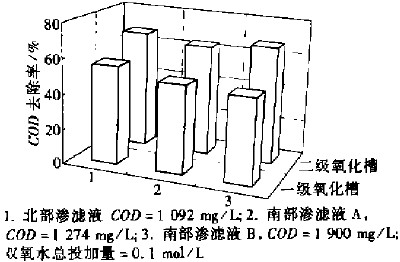Fenton法處理垃圾填埋場滲濾液的中試結果表明,當雙氧水與亞鐵鹽的總投加比一定時,COD的去除率隨雙氧水投加量的增大而增加,但與雙氧水在兩個氧化槽的投加比例無關。當雙氧水的總投加量為0.1 mol/L時,COD去除率可達67.5%,而且這一結果適用于其他填埋場的晚期滲濾液。