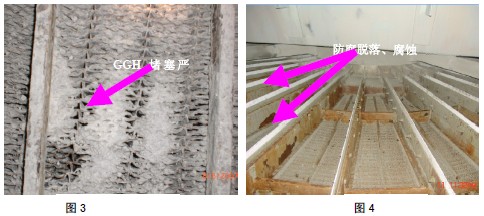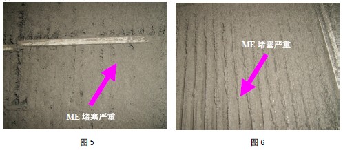 吸收塔水平衡是脫硫裝置長期穩定運行的基礎,除霧器的定期沖洗是保證除霧器長期、高效運行的保障。實際運行中很多電廠由于無法使補充進入脫硫塔的水量和流出脫硫塔的水量保持平衡出現脫硫塔漿液溢流的現象,竟而長期對除霧器不進行沖洗,使除霧器堵塞嚴重,甚至出現過除霧器坍塌的現象,下圖是除霧器嚴重堵塞的圖5、圖6: