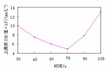 3.2.4 最佳攪拌時間和攪拌強度的選擇 取200 mL的拉絲廢水放入燒杯中進行實驗,向廢水中加入8 mL的PFS,用攪拌機進行攪拌。調節攪拌機的轉速,反復進行實驗,當高速攪拌為400 r/min、低速攪拌為100 r/min時,廢水處理效果最好。所以確定最佳攪拌強度為:高速400 r/min;低速100 r/min。高速攪拌時間分別取30、45、60、75、90和105 s;低速攪拌時間分別為120、150、180、200、240和270 s。攪拌結束后沉淀2 h,取上清液測定COD值。