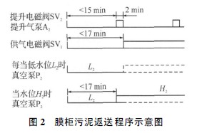膜柜內的濃縮污水設計成自動停曝程序, 膜柜內沉淀污泥也自動定期用氣提法返回至曝氣柜。每當膜柜內水位被抽至低位時, 曝氣電磁閥關閉17 min, 使膜柜污泥沉淀, 提升電磁閥關閉 15 min 后開2 min, 將膜柜內污泥提升至第一級。當低水位時, 提升電磁閥關閉15 min 后開啟 2 min, 曝氣電磁閥關17 min 后一直開啟, 在上述17 min 內, 如果水位至高位時, 控制程序中斷, 見圖2。