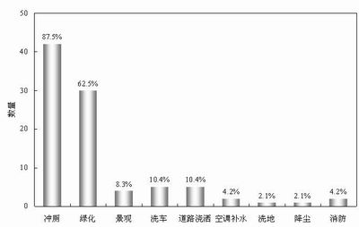 目前我國社區污水再生利用大多以沖廁和小區雜用為主。2004年8月~2005年3月,筆者對京津地區的48家社區污水再生利用狀況作了調研(其中商業樓宇、大專院校、居民小區各16家),其出水用途統計如圖1所示。可見在社區污水再生利用中,沖廁和綠化占了相當大的比例。