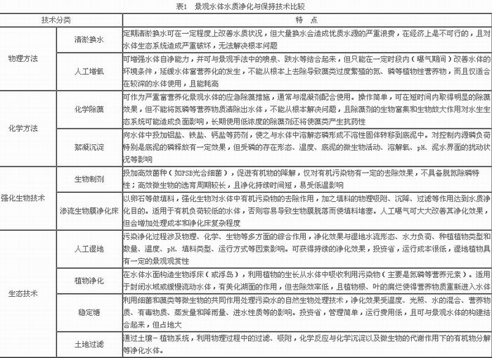 目前常見的景觀水體水質凈化與保持技術及其特點比較見表1[4~17]。
