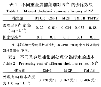 Ni2+濃度為1.0 mg·L-1的模擬廢水,pH值調為8.0.因為根據Ni(OH)2的溶度積計算,pH>8.7時Ni2+產生沉淀,而且傳統化學沉淀出水一般為堿性.分別用DTCR、MCP、TMTB、TMTF及CM-1重金屬捕集劑對模擬廢水進行處理,捕集劑投加量為各自理論投加量的1.2倍(所需的DTCR、CM-1、MCP、TMTB和TMTF的理論投加量分別為0.12、0.11、0.12、0.10 mL和0.10 mL,此數據由試劑供應商提供),實驗結果見表1.由表1可知,CM-1、MCP和TMTB均能使含Ni2+廢水達標排放,其中CM-1處理效果最好.