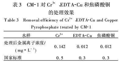 接著,用CM-1分別處理含Cr3+、EDTA-Cu和焦磷酸銅的模擬廢水,水樣中金屬離子濃度均為1.0 mg·L-1,pH值為8.0,捕集劑投加量為1.2倍理論投加量,實驗結果如表3所示.由表3知,在對含Cr3+、EDTA-Cu和焦磷酸銅的廢水處理中CM-1同樣表現出良好的去除重金屬的性能.綜上,CM-1是處理低濃度電鍍廢水的最佳選擇.