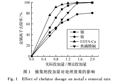 用CM-1分別處理含Ni2+、Cr3+、EDTA-Cu和焦磷酸銅的模擬廢水,水樣中金屬離子濃度均為1.0 mg·L-1,pH值為8.0,分別在0.6、0.8、1.0、1.2、1.5、2.0倍理論投加量的條件下進行實驗,結果如圖1所示.
