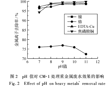 由圖2分析可知,當pH值在7~9時,各金屬離子的去除率均隨著pH值的增大而增大;pH值繼續增大時,Ni2+、EDTA-Cu和焦磷酸銅的去除率保持不變,而Cr3+的去除率反而下降.這主要是因為在pH值為7~9時,游離的金屬離子以堿性沉淀的方式被去除;兩性離子Cr3+在較高pH值條件下生成多羥基化合物,而CM-1可能對多羥基化合物的螯合沉淀能力較差,導致了去除率的下降.