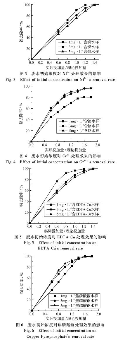 分析各圖可知,對于Ni2+和EDTA-Cu,廢水初始濃度為1.0 mg·L-1時,最佳投加量為理論投加量的1.2倍左右,初始濃度為5.0 mg·L-1時,最佳投加量是理論投加量的1.4倍左右,初始濃度為3.0 mg·L-1時,最佳投加量為理論投加量的1.2~1.4倍.類似,對于Cr3+和焦磷酸銅,其廢水初始濃度為1.0、3.0、5.0 mg·L-1時的捕集劑最佳投加量分別為1.5倍、1.5~1.6倍和1.6倍的理論投加量.