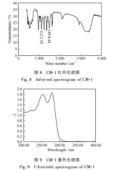 2.6 捕集劑CM-1成分分析 在500~4 000 cm-1,對CM-1進行紅外光譜測定,確定其主要官能團及物質類別.在200~400 nm,以水為溶劑,對CM-1進行紫外-可見光譜測定,進一步確定其類別.圖8和圖9分別是CM-1的紅外光譜掃描曲線和紫外光譜掃描曲線.