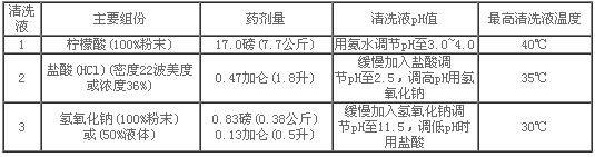 表2-常規清洗液配方提供的清洗溶液是將一定重量(或體積)的化學藥品加入到100加侖(379升)的潔凈水中(RO產品水或不含游離氯的水)。溶液是按所用化學藥品和水量的比例配制的。溶劑是RO產品水或去離子水,無游離氯和硬度。清洗液進入膜元件之前,要求徹底混和均勻,并按照目標值調pH值且按目標溫度值穩定溫度。常規的清洗方法基于化學清洗溶液循環清洗一小時和一種任選的化學藥劑浸泡一小時的操作而設定的。