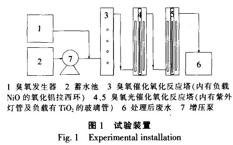 試驗裝置如圖1。反應塔總體積為2.7 L,在廢水流速為20 L/h時臭氧化反應時間約為8 min,在氧氣投加量為50 L/h條件下廢水中臭氧的質量濃度為15 mg/L。光催化氧化反應塔中紫外燈功率為39W,光強為130 uW/m2 ,波長為254nm。