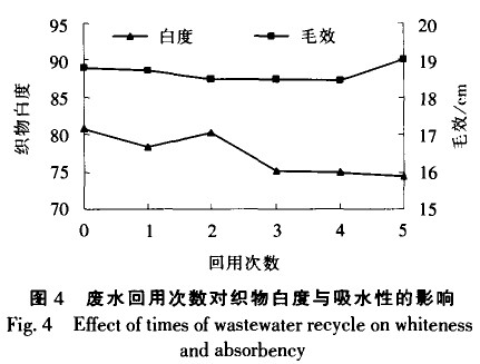 對洗滌廢水進行連續在線處理并加以回用,隨著回用次數增加,織物白度略微下降、吸水性有所提高:經5次回用,白度的下降幅度在5個白度值以內。各樣布在后續染色加工中產生的色差在0.25以內。廢水回用所產生的影響不大。