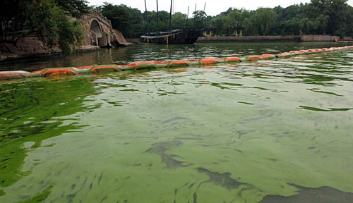 資料圖片:2006年6月15日,江蘇省無錫市黿頭渚風景區太湖邊部分水域積聚了大量的藍藻。據介紹,藍藻的出現主要是有機污染、農業污染和生活污染所致。 |