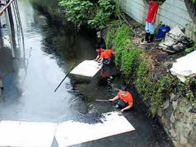 印染廠工人在水中用布打撈重油油污。 |