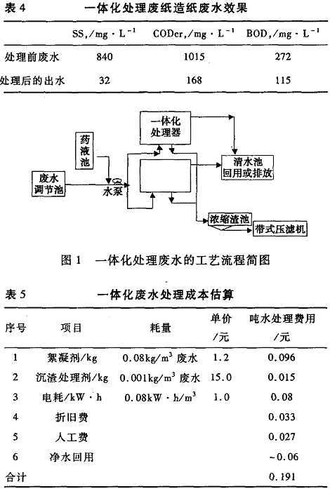 華南理工大學長期從事廢紙造紙廢水處理新技術的研究,在該領域取得多項國家專利技術,主要是采用混凝沉淀與吸附過濾相結合的方法在特效廢水處理器中對廢水進行處理,處理效率高,大大提高了出水水質。采用一體化設備在某OCC廢紙造紙廠對10000 m3/d的廢紙制漿造紙廢水進行處理的工藝圖如圖1所示,一體化設備兩臺,每臺的處理量為5000m3/d 。該OCC廢紙造紙廢水從外觀看為含土黃色懸浮物的混濁液,污染物特征如表3所示。從表4可以看出,采用一體化設備處理廢紙造紙廢水,BOD , COD的去除率為80%左右,SS的去除率可達85%以上。采用一體化設備每噸廢水的處理成本見表5所示。