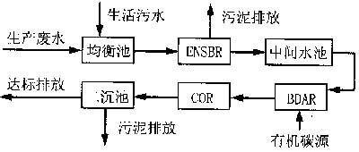 該公司原廢水處理采用A/O/A/O工藝,經半年多的試運行,各項出水指標(COD,BOD,氨氮,色度)嚴重超標。通過對原工藝運行不佳的原因分析,并在試驗研究的基礎上,將廢水處理工藝改造成ENSBR/BDAR/COR生物處理工藝。2001年4月調試后,連續運行至今,監測結果表明,裝置已達到設計能力,出水水質全面達標。本文就改造工程工藝設計作一簡要介紹。