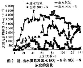 整個運行過程中進、出水氨氮濃度及出水NO2-N和NO3-N濃度的變化如圖2所示。