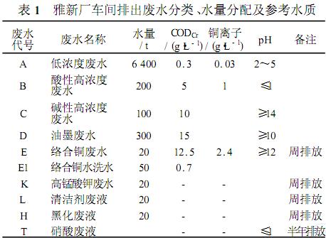 線路板廢水可根據各工序所排出的不同廢水進行分類,普通含銅廢水來源于各工藝流程的清洗程序及廢液排放;油墨廢水來自于顯影工序;絡合銅廢水來自于蝕刻工序;電鍍廢水來源于電鍍銅工序。雅新及迪吉所排的廢水總水量為7000m3/d。